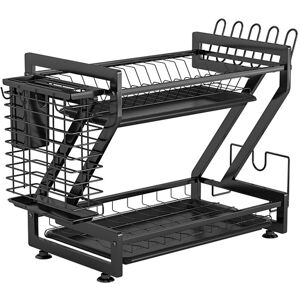 LIFCAUSAL Estante para secar platos sobre el fregadero con tablero de drenaje Escurridor de platos de acero al carbono de 2 niveles Organizador de utensilios